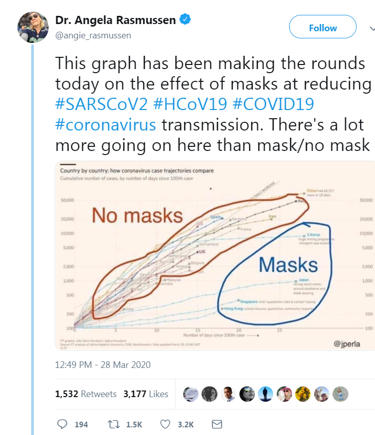 This graph has been making the rounds today on the effect of masks at reducing #SARSCoV2 #HCoV19 #COVID19 #coronavirus transmission. There's a lot more going on here than mask/no mask pic.twitter.com/vdSMAsmhoX
