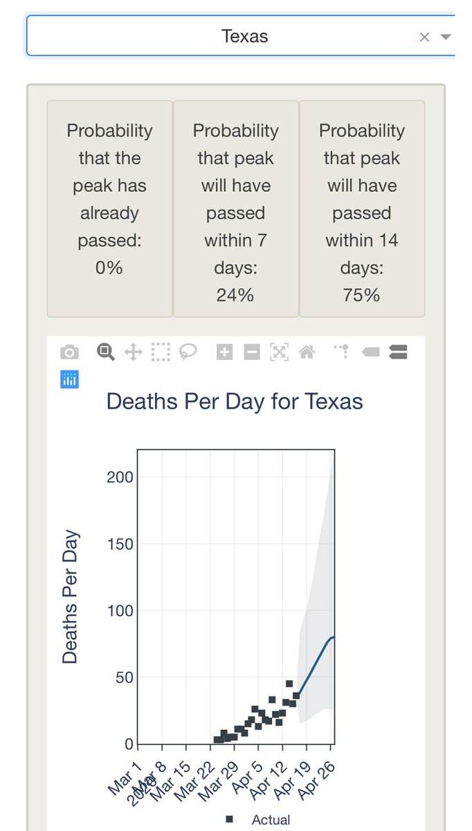 The University of Texas has its own state by state COVID-19 modeling project https://covid-19.tacc.utexas.edu/projections/  HT: @Alicia_Smith19 They project that Texas itself is still several days away from its own mortality peak. Could be problematic for a state that’s champing at the bit to reopen pic.twitter.com/vMw34AqbsA