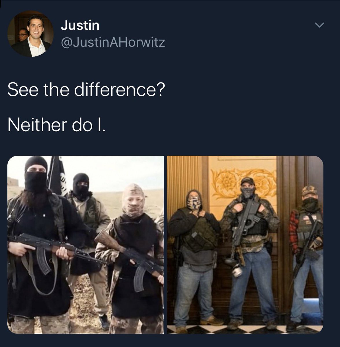 C'mon, he sees the difference - one group he sees as his enemy; the other is ISIS