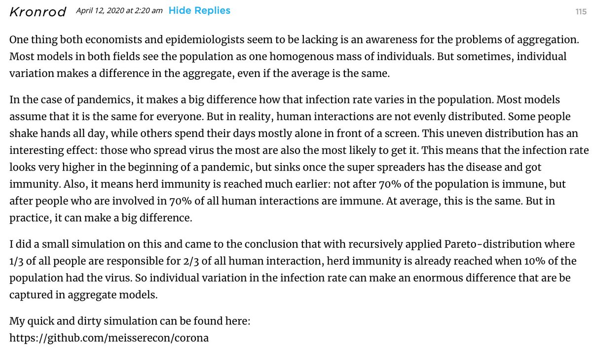 A lot of people claim that, given that even in NYC only ~20% of people seem to have been infected, we are still a long way from herd immunity, but I'm actually not sure this is correct for the kind of reasons outlined by this guy in a comment to @tylercowen's controversial post.pic.twitter.com/e2koLTSdr9