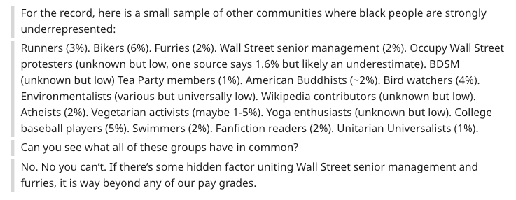 It's refreshing to hear this stated so clearly even though I think discrimination as the null hypothesis is both damaging and often wrong. Here is a great passage from @slatestarcodex on how Black people are underrepresented in many communities on the right and the left. https://twitter.com/random_walker/status/1275796002067415040 …pic.twitter.com/CwyvKbXav5