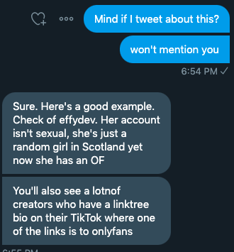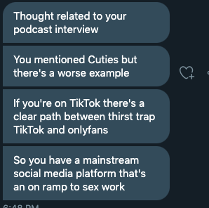 A friend just alerted me to something pretty dark. TikTok is apparently a straight-up onramp for girls to OnlyFans. Whatever you think about choice, I think this trend will have very bad mental health repercussions in these girls' lives down the line.pic.twitter.com/oKBtLLhtaJ