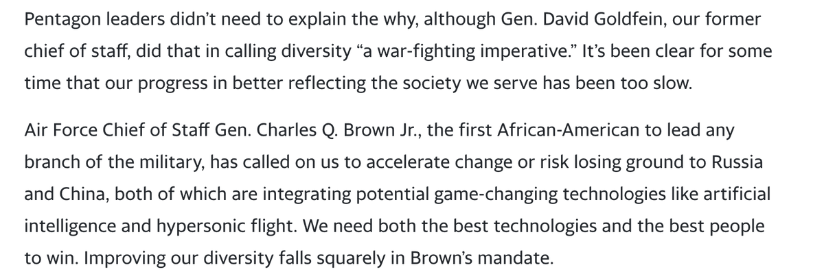Head of Air Force recruiting says too many pilots are white men, which must change lest the US "risk losing ground to Russia and China, both of which are integrating potential game-changing technologies like artificial intelligence and hypersonic flight." https://news.yahoo.com/86-of-air-force-pilots-are-white-men-heres-why-this-needs-to-change-155046366.html?guccounter=1 …pic.twitter.com/DdP6pQSRdw