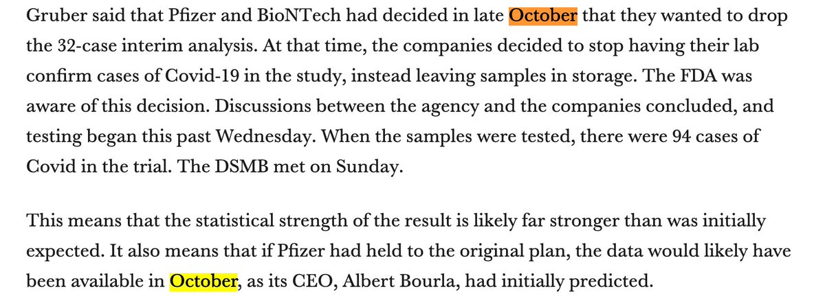 Why did Pfizer and FDA agree to not release the news of the vaccine's success in October as the original protocol of a 32 -case interim analysis would have required? From StatNews:pic.twitter.com/s1XrgR3kDq