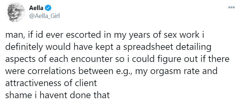 She kept a spreadsheet of her coomer efficiency with her escort clients.