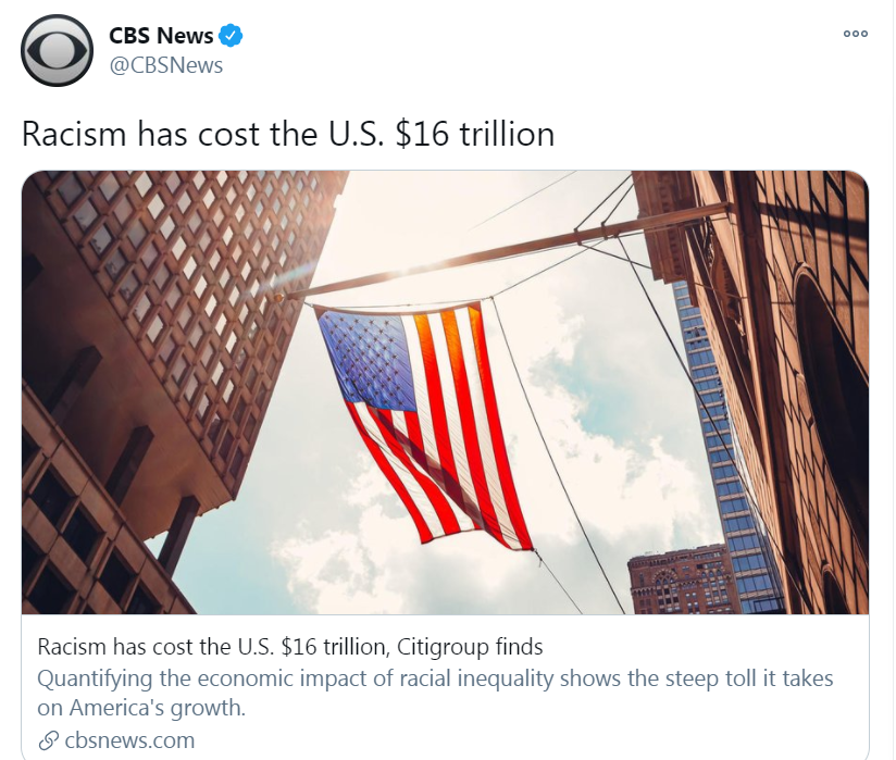 Not hard to obtain 16 Trillion if you assume Joe hanging out at the corner bodega, without racism, would have been a high earning cardiologist. Add that up, and exponentialize it over time, et voila!