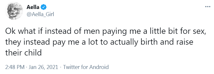 She's got to be doing a bit, right? "What if I just reinvented being a wife?" Also amazing to think that she thinks that a man would pay "a lot" for her to birth his children. Are men typically happy when they hear that a prostitute is pregnant with his child?pic.twitter.com/2cNGX04IY2