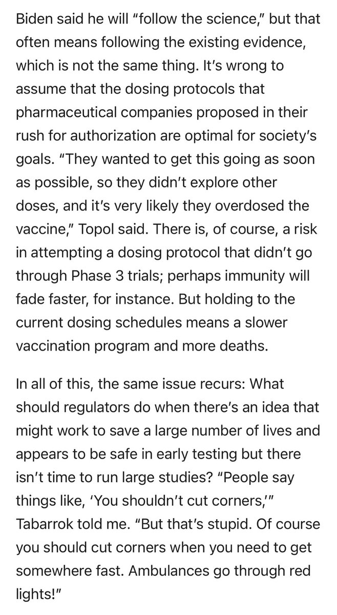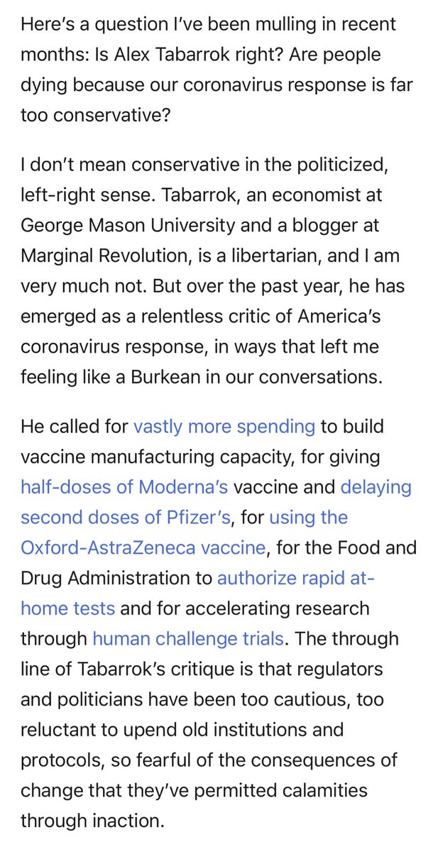 So much wisdom in this @ezraklein article about @ATabarrok & our COVID response: “People say things like, ‘You shouldn’t cut corners,’” Tabarrok told me. “But that’s stupid. Of course you should cut corners when you need to get somewhere fast. Ambulances go through red lights!” pic.twitter.com/1D5gbAgWjC