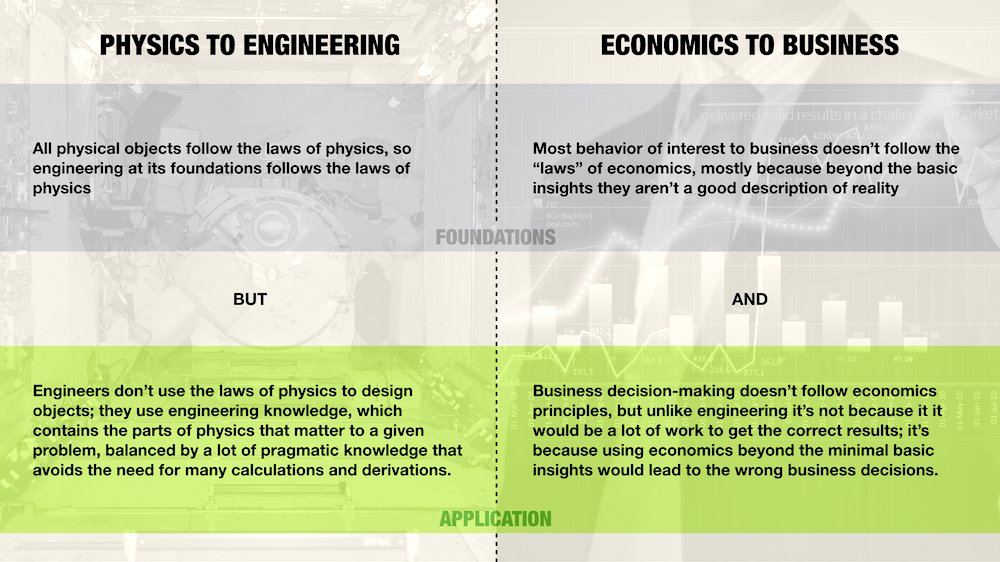 "Things fall down when you release them" is general physics logic. I agree that economics at that level "works" inasmuch as that's "working." x = 1/2 g t^2 is Physics you can build engineering on. There's no equivalent in econ, where one parameter solves a class of problems.