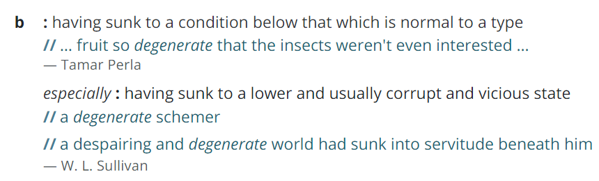 What is "degenerate" for a woman and for a man are different because women and men are different. This is pathetic cope by you because you're afraid to say or think anything mean to a woman - it might hurt her feelings and make her cry.