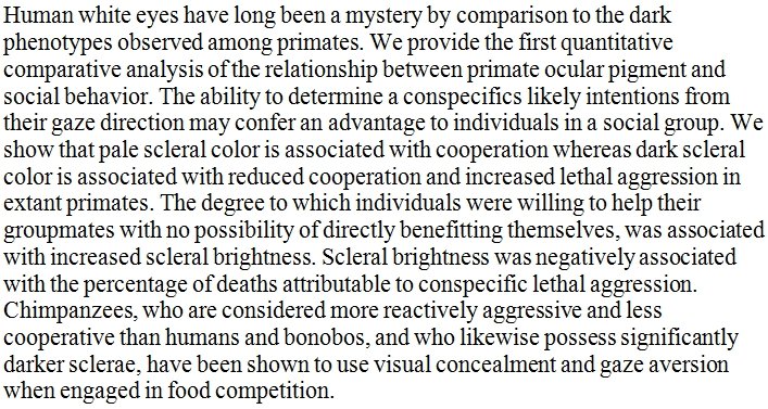 Across primates, the degree of whiteness in the eyes, which allows to follow others' gaze, is linked to increased cooperation and decreased lethal aggression. https://www.biorxiv.org/content/10.1101/2021.07.25.453695v1?rss=1&utm_source=dlvr.it&utm_medium=twitter …pic.twitter.com/xdnRSS7XKU