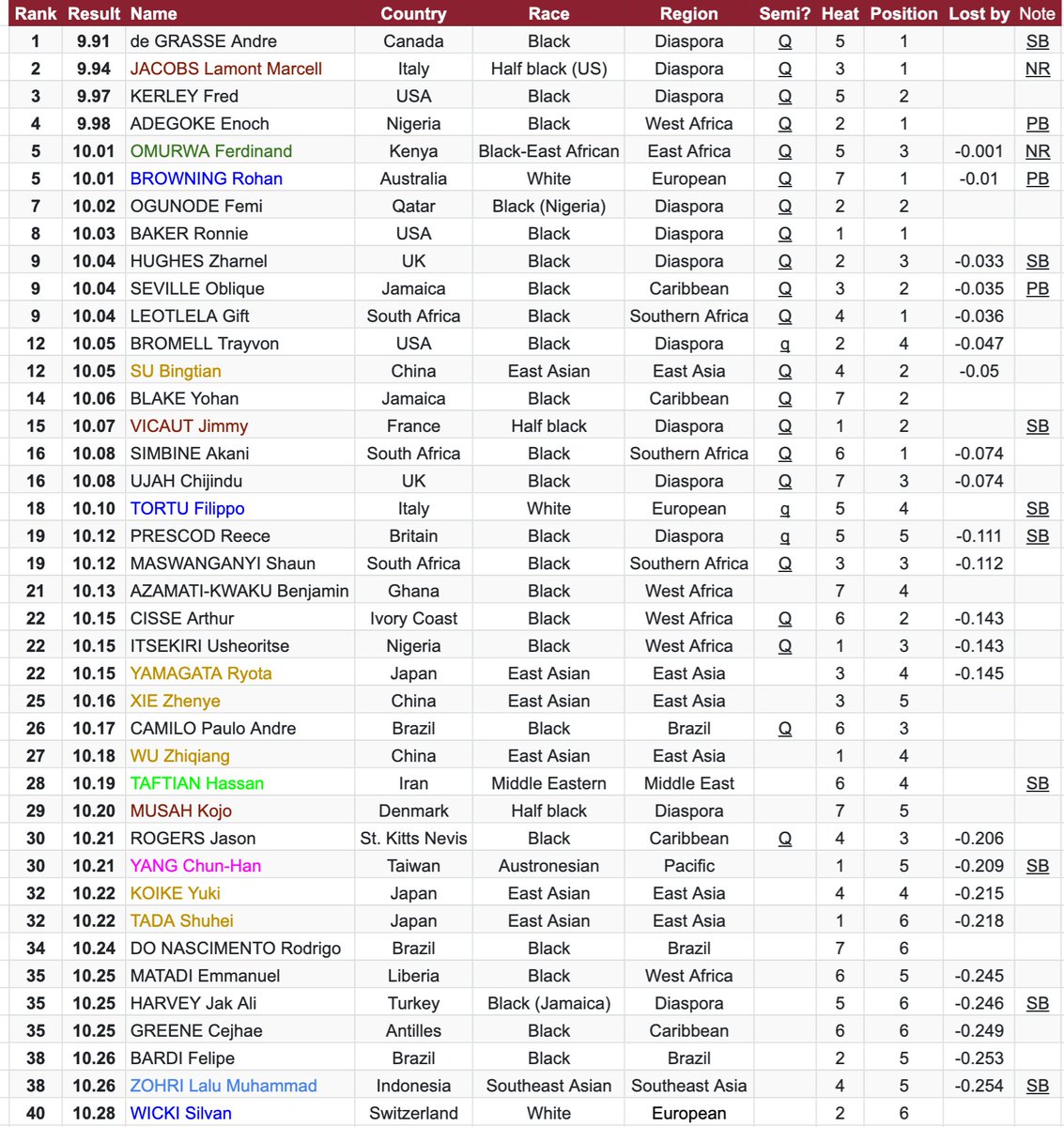 Will a nonblack make the final 8 of the Race to Be the World's fastest man, the Olympic 100m dash, for the first time since 1980, snapping a black streak of 72 of 72? Two whites and a Chinese are among the 24 semi-finalists. Top 40 fastest heat times here: https://www.unz.com/isteve/race-and-the-race-to-be-the-worlds-fastest-man/ …pic.twitter.com/BGEQRm6MXh