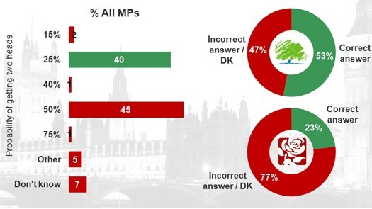 In a coin toss, what's the chance of getting two heads in a row? Someone had the brilliant idea of asking politicians. 77% of UK Labour MPs didn't know, only 23% did. It was about half and half with Conservatives.pic.twitter.com/v1e8cTfUAq