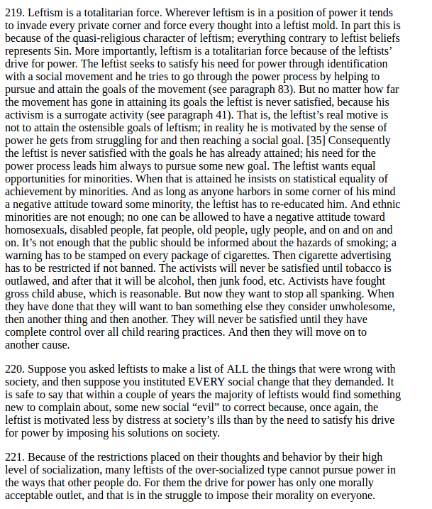 The deep irony here is that the rote, almost panicked rejection of the possibility that Ted Kaczynski had anything interesting to say is a perfect example of the oversocialized leftist personality that Kaczynski's work nailedhttps://twitter.com/atrupar/status/1445913537310871552 …