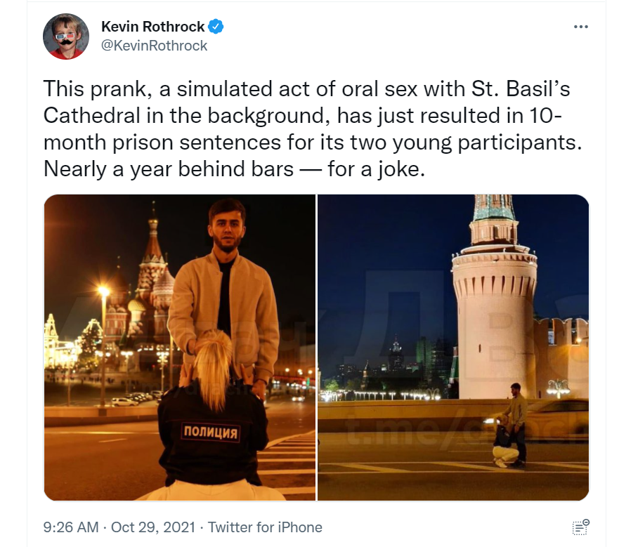 In America you get 10 years in prison for burning a gay pride flag. Now that we've established that every society has anti-blasphemy laws let's talk about which mores are healthy and which are destructive. https://twitter.com/KevinRothrock/status/1454077128597819393 …