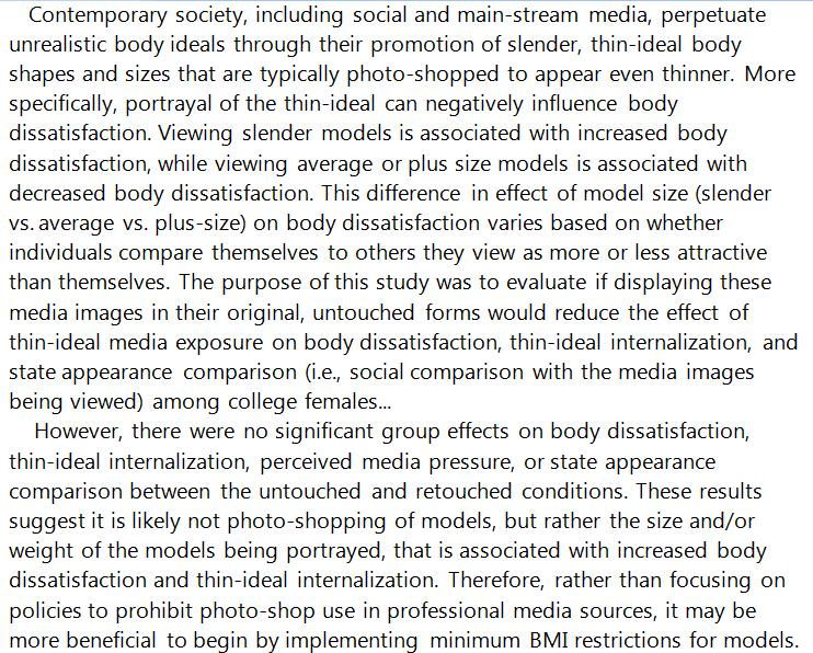 Unvarnished truth: Viewing images of fashion models decreased women's body satisfaction even if the portrayals were not photoshopped. https://search.proquest.com/openview/f2cc52b5b26dbf1c295d022a0f7d389a/1?pq-origsite=gscholar&cbl=18750&diss=y …pic.twitter.com/W9Mias5vgD