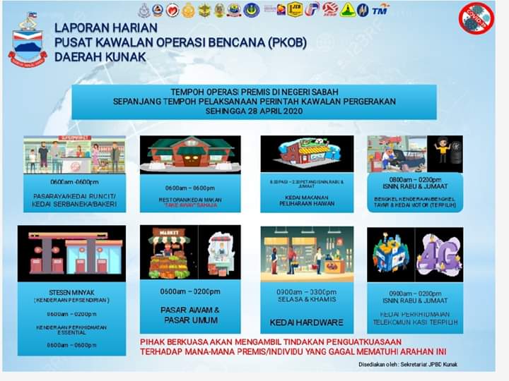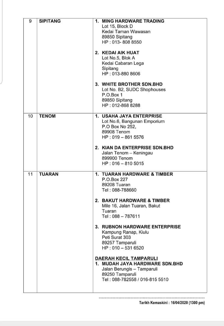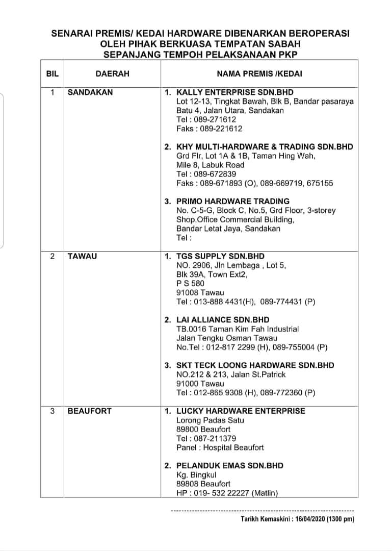 Senarai Premis/Kedai Hardware Dibenarkan Beroperasi oleh Pihak Berkuasa Tempatan Sabah Sepanjang Tempoh Pelaksanaan Perintah Kawalan Pergerakan (PKP). Sumber: