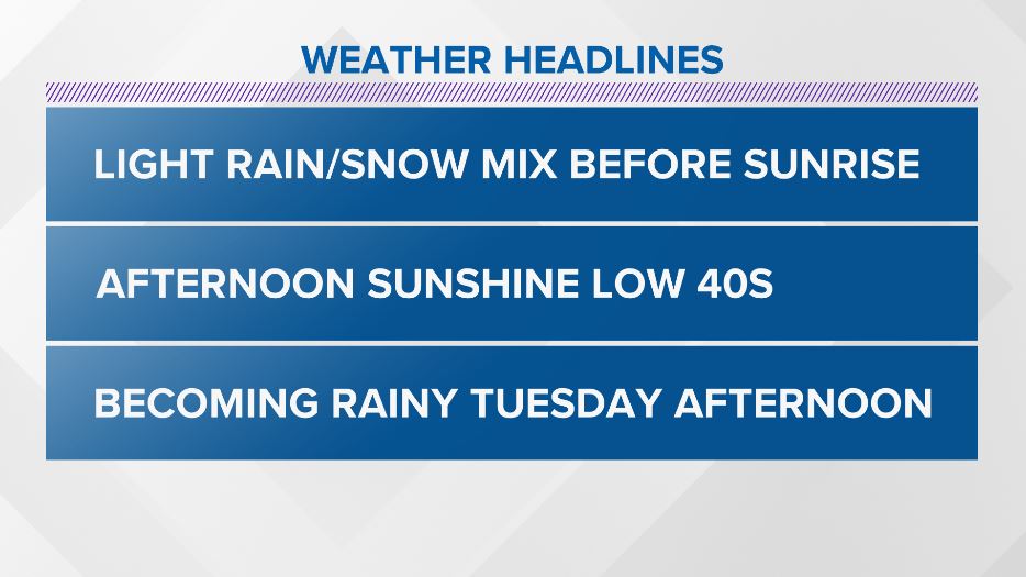 We'll have light scattered rain/snow showers for before 10am, then sunbreaks for a good part of the day. Then light scattered rain/snow showers after sunset overnight. Accumulations should be light & melt fast.