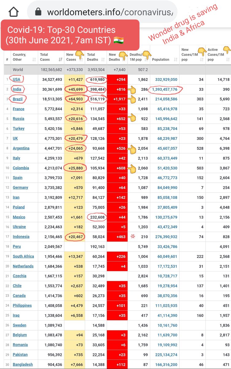 Wonder drug is saving India (1380 million pop) & Africa (1350 million pop). https://www.worldometers.info/coronavirus/ pic.twitter.com/JdCzBWLVm0
