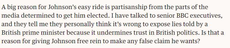 If you haven't seen it, an extremely important article from Peter Oborne. The Tory bias of the BBC is a very serious matter indeed, added to the overwhelming right wing stance of private media owners. The UK is not functioning as a genuine democracy. https://www.theguardian.com/commentisfree/2019/nov/18/boris-johnson-lying-media?CMP=Share_iOSApp_Other …pic.twitter.com/6wvRu62yOC