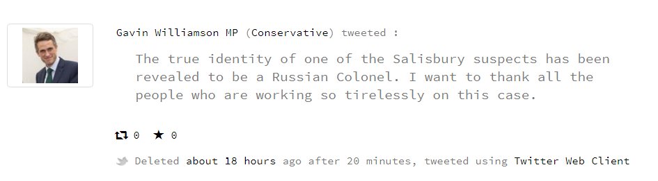 Oh boy... Whitehall claimed: "Two GRU agents have been known to Intel for a few years" Yet y/day UK minister congratulated #Bellingcat for revealing true ID of #Salisbury suspect! Who is feeding whom?! 1 https://www.rt.com/uk/439559-williamson-tweet-skripal-bellingcat/?utm_source=rss&utm_medium=rss&utm_campaign=RSS … 2 https://www.politwoops.co.uk/p/conservative/GavinWilliamson/1045015928830873600?utm_source=politwoops.co.uk&utm_medium=twitter&utm_content=1045015928830873600&utm_campaign=repost … #Skripals #Chepiga pic.twitter.com/QcZh78oPbc
