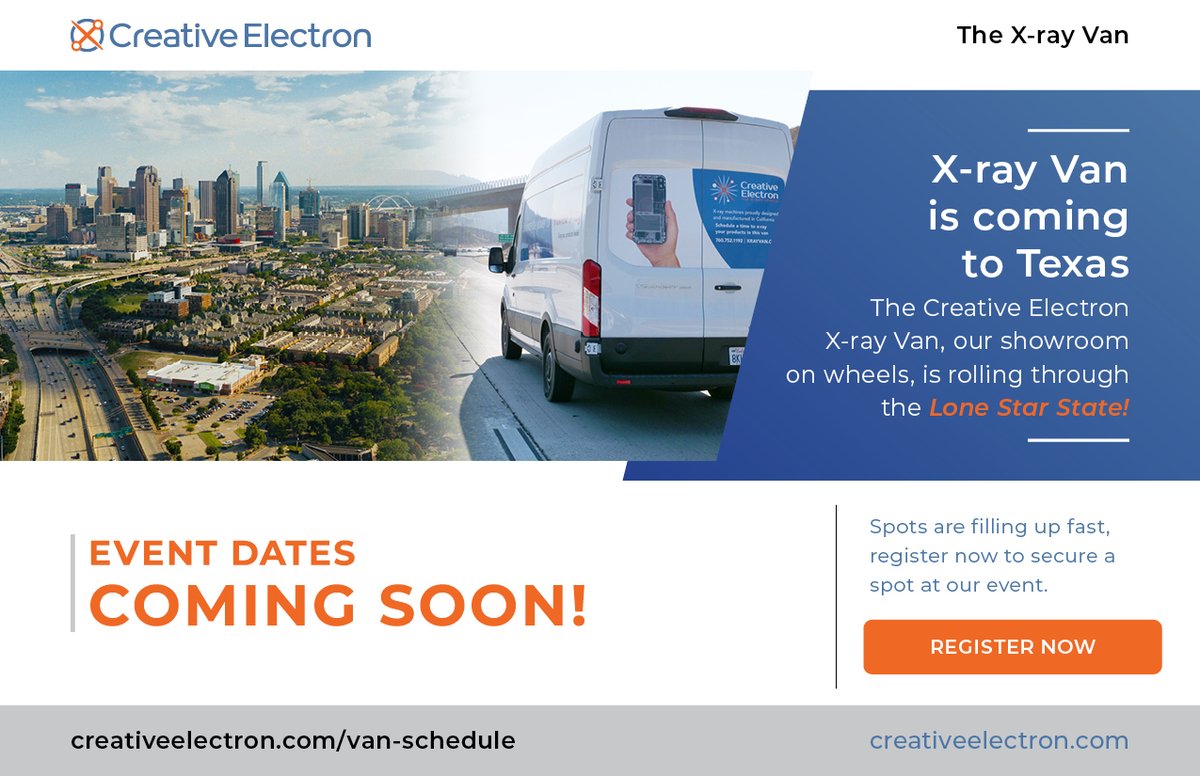 Texas—The X-ray Van is visiting the Lone Star State soon. Feel free to book a free x-ray inspection demo. https://creativeelectron.com/van-schedule/