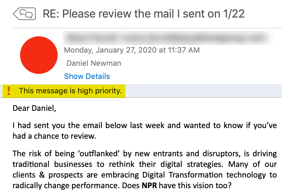 Also, flagging a cold email as “high priority” (or, god forbid, turning on "read receipts") is a SURE way to motivate me to mark you as spam.pic.twitter.com/zsK4BUcLEd