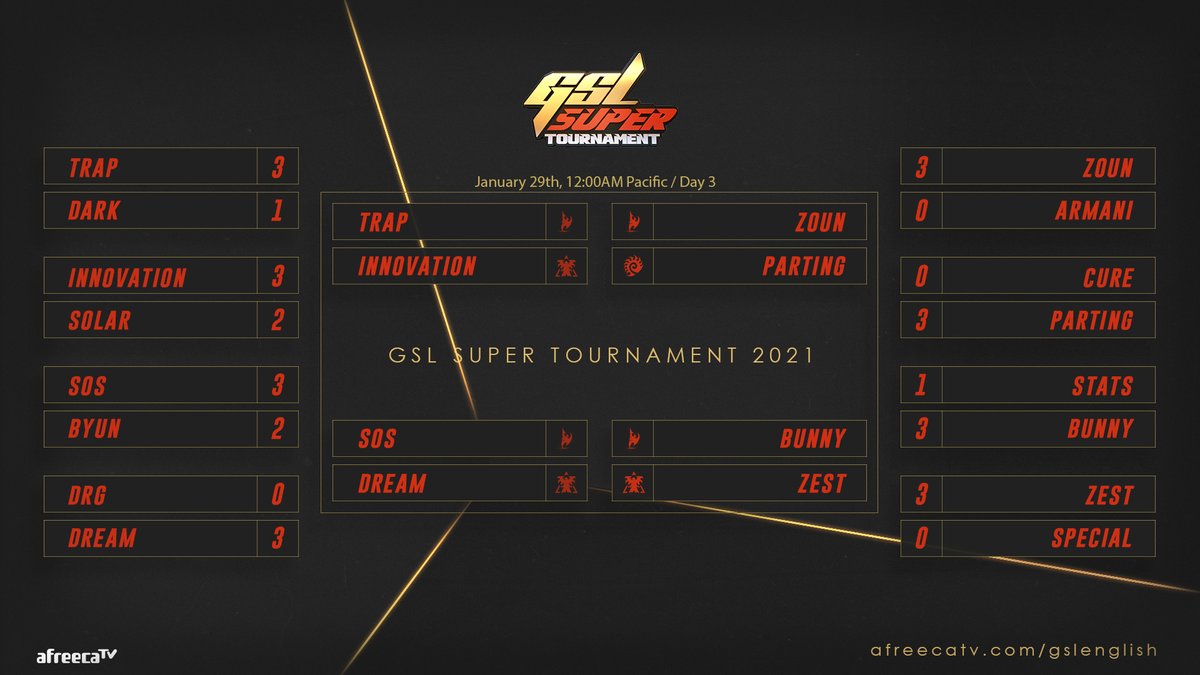 𝘿𝙖𝙮 2 𝙎𝙥𝙤𝙞𝙡𝙚𝙧 𝘼𝙡𝙚𝙧𝙩 [2021 GSL Super Tournament] Day 3 - The Round of 8! Starts 1/29 @ 12AM Pacific http://play.afreecatv.com/gslenglish pic.twitter.com/k26Ot5veRs