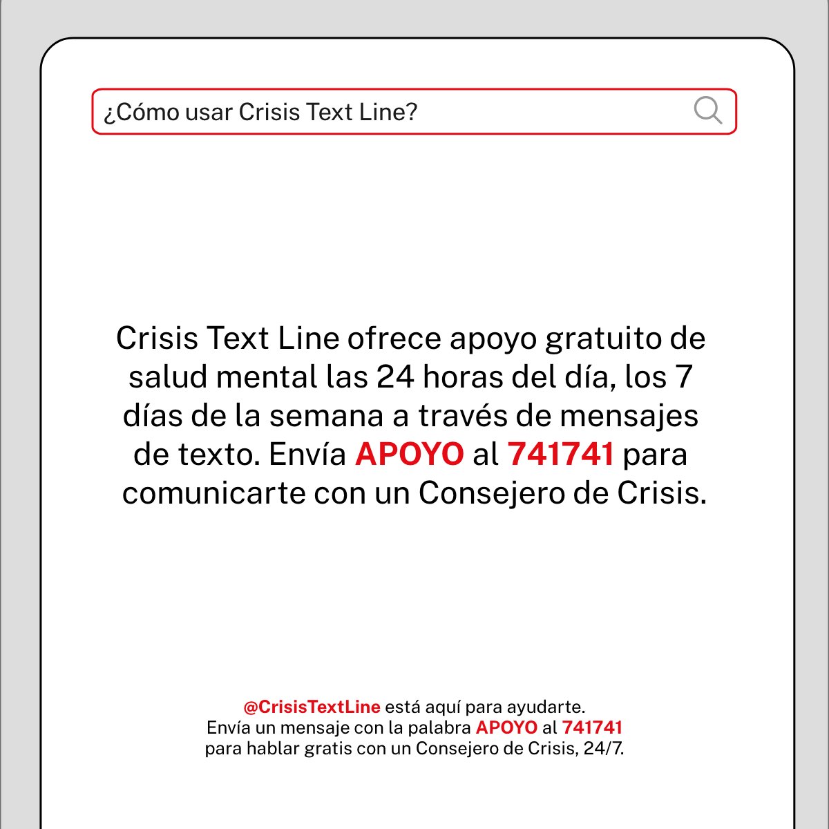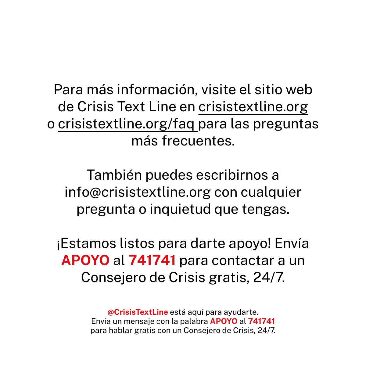 Para más información, visita nuestra página Web (http://www.crisistextline.org/es/ ) o preguntas frecuentes (http://crisistextline.org/es/politica-de-privacidad …). También puedes enviarnos un correo electrónico a info@crisistextline.org con dudas o preguntas que puedas tener.pic.twitter.com/K79hLkwyO5