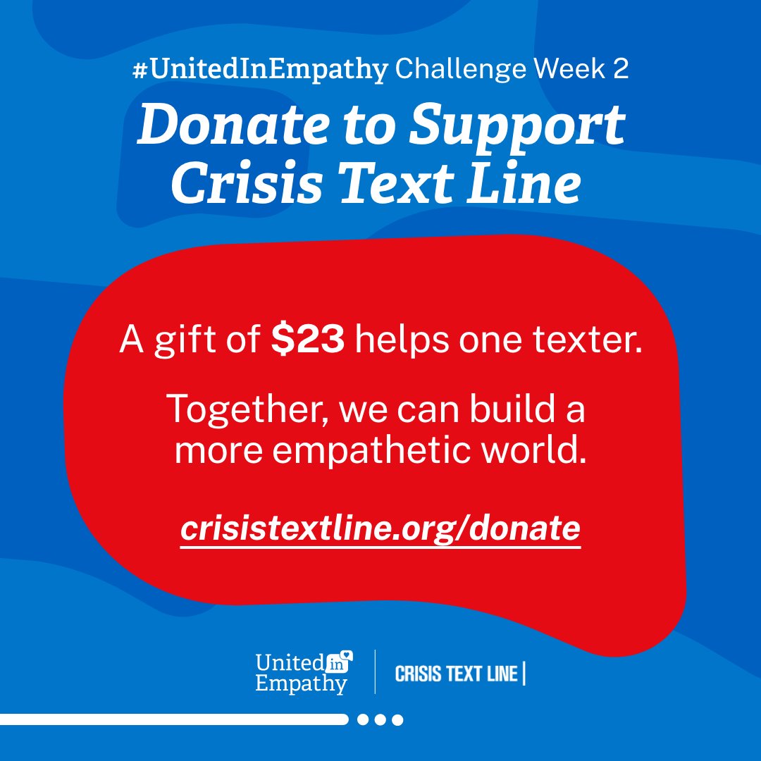 . Together, our community showed up to support free, 24/7 mental health support for the #UnitedInEmpathy Challenge. It’s not too late to get involved. Visit http://www.crisistextline.org/donate to help us reach our goal.Thanks. Twitter will use this info to make your timeline better. UndoUndo -
