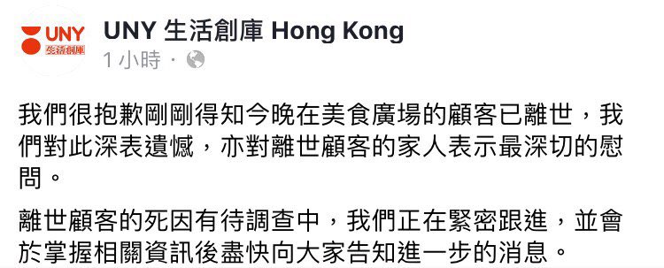 Feb 2: UNY Hong Kong announcement - A customer suddenly fainted in the food court tonight have passed away. The cause of death of the deceased customer is under investigation. Will inform as soon as possible after having relevant information.pic.twitter.com/08mimD9MMA