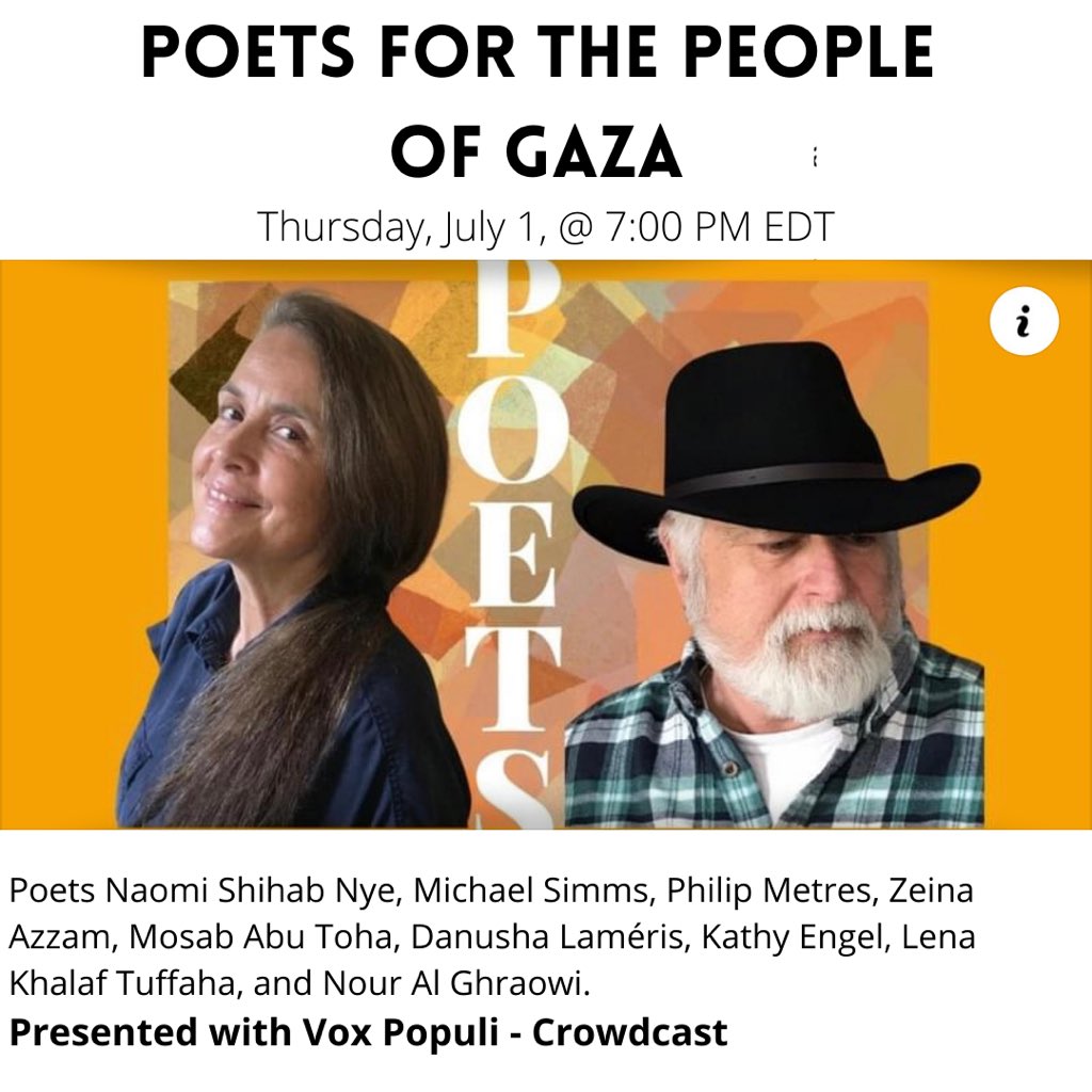 https://www.crowdcast.io/e/poets-gaza Naomi Shihab Nye, the current Young People's Poet Laureate, and poet Michael Simms gather international poets to share works that navigate themes of identity, displacement, and home in Gaza.pic.twitter.com/QXhd4uzb9f