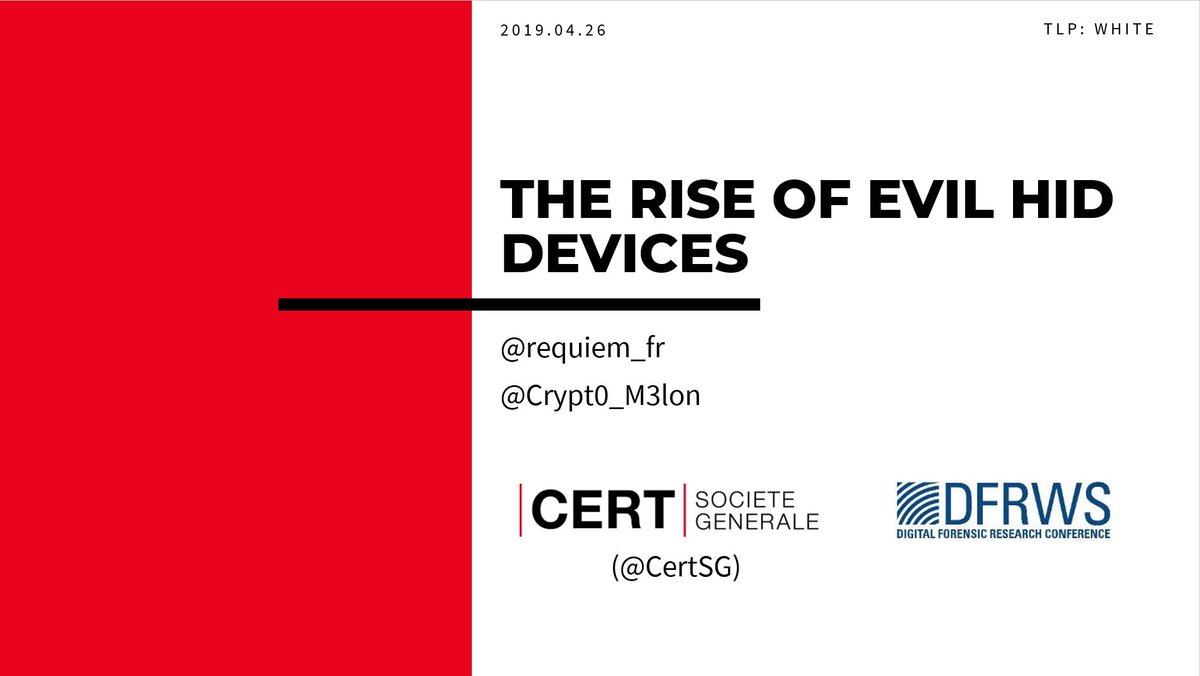 @Crypt0_M3lon and@Requiem_fr at@DFRWS have been released on our GitHub repo : https://github.com/certsocietegenerale/Publications/blob/master/DFRWS%20EU19%20-%20The%20Rise%20Of%20HID%20Devices.pdf …#DFIR#blueteam#redteam#forensicspic.twitter.com/y14p2Ytt57