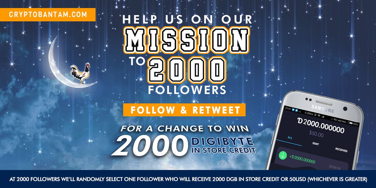 2000 DGB store credit will be given to one of our followers when we hit 2000. Prize value update: | 76USD | 0.011BTC | 0.925LTC | as at 17 July FOLLOW