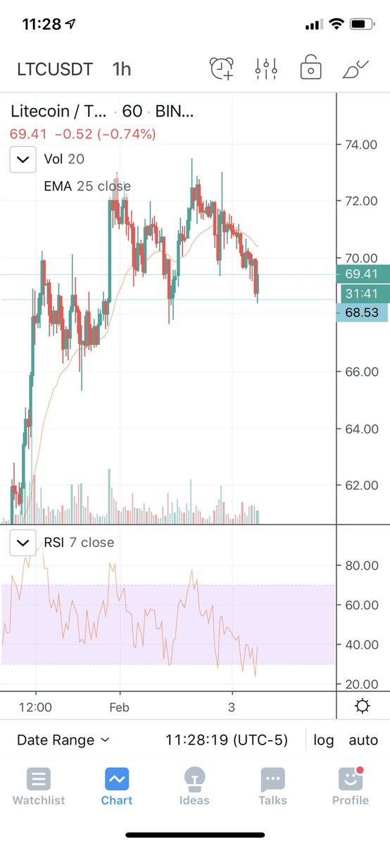 $LTC back to a critical support level. RSI reflecting we might be oversold. Bids spread between 68.50-69.25 with tight SL.pic.twitter.com/MnbLp5w9Ao