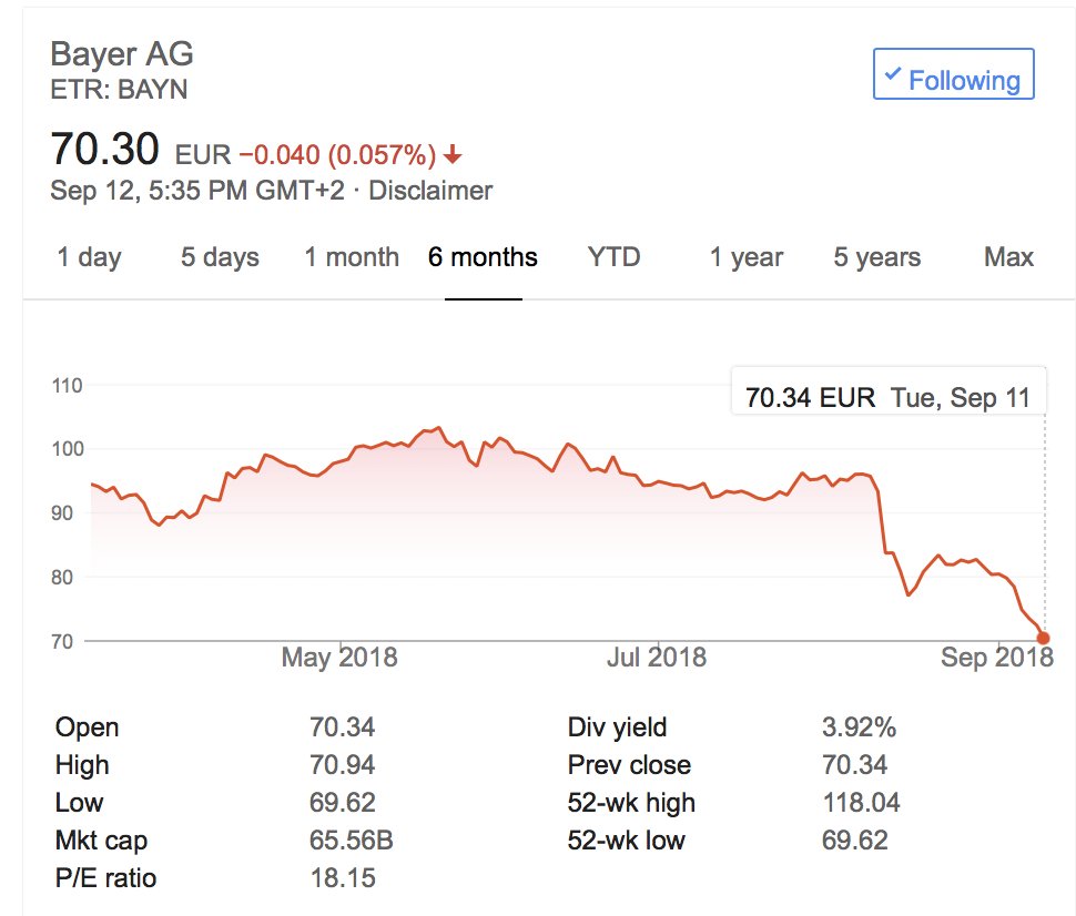 Delenda MONSANTO. Thank you markets. Let the death spiral start. Bayer is down 30% over the past couple of months. There are >8000 lawsuits coming. Never ever build your business messing with science & smearing scientists. It all comes out. Monsanto shills are unprotected.pic.twitter.com/U00l6c2d1j