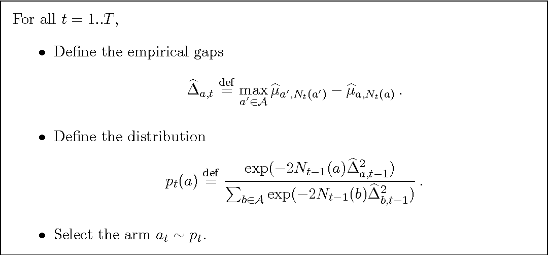 Folks, have a winner. For the stochastic bandit, this gem from Odalric-Ambrym Maillard's thesis, called EwS, works incredibly well and gives explicit probabilities on the arms. I compare EwS with Thompson & Tsallis in https://gist.github.com/n17s/44a7ddcf078a041755a2c537aa9d3e14 …