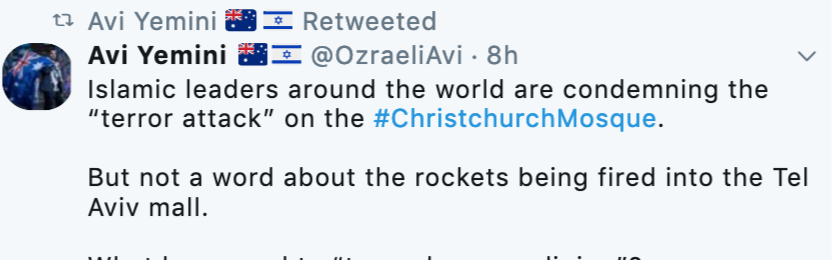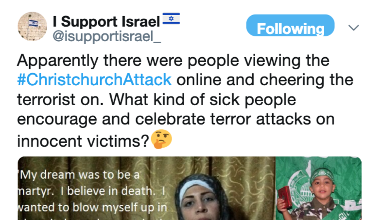 Israeli accounts are using the #ChristchurchMosqueAttack to drum up support for #Israel. Which is ironic since the shooter railed against 'replacement populations' and they're the population's replacing Palestinians. Also ironic that like the shooter they support ethnic cleansing pic.twitter.com/uOLXgl7kOQ