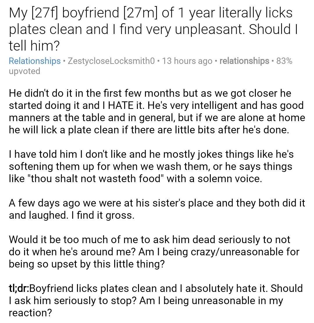 My [27f] boyfriend [27m] of 1 year literally licks plates clean and I find very unpleasant. Should I tell him?pic.twitter.com/1g9AXdM1rj