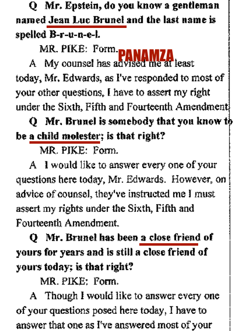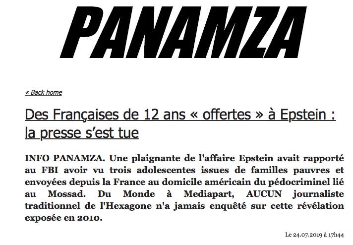 "Des Françaises de 12 ans «offertes» à Epstein": l'info de Panamza {http://www.panamza.com/240719-francaises-12ans-epstein/ …} est corroborée par l'interrogatoire d'Epstein (qui refusa de répondre). À noter -"l'expéditeur" de ces Françaises serait le Français #JeanLucBrunel. Silence des me(r)dias FR sur le sujetpic.twitter.com/YE8wEidP3U