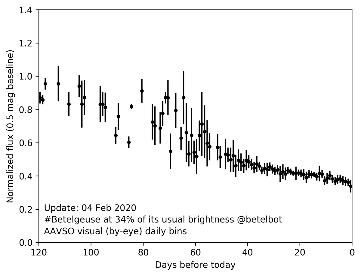 #Betelgeuse today at its dimmest in 125 years at 1.62 magpic.twitter.com/yhoqf4Uxsu