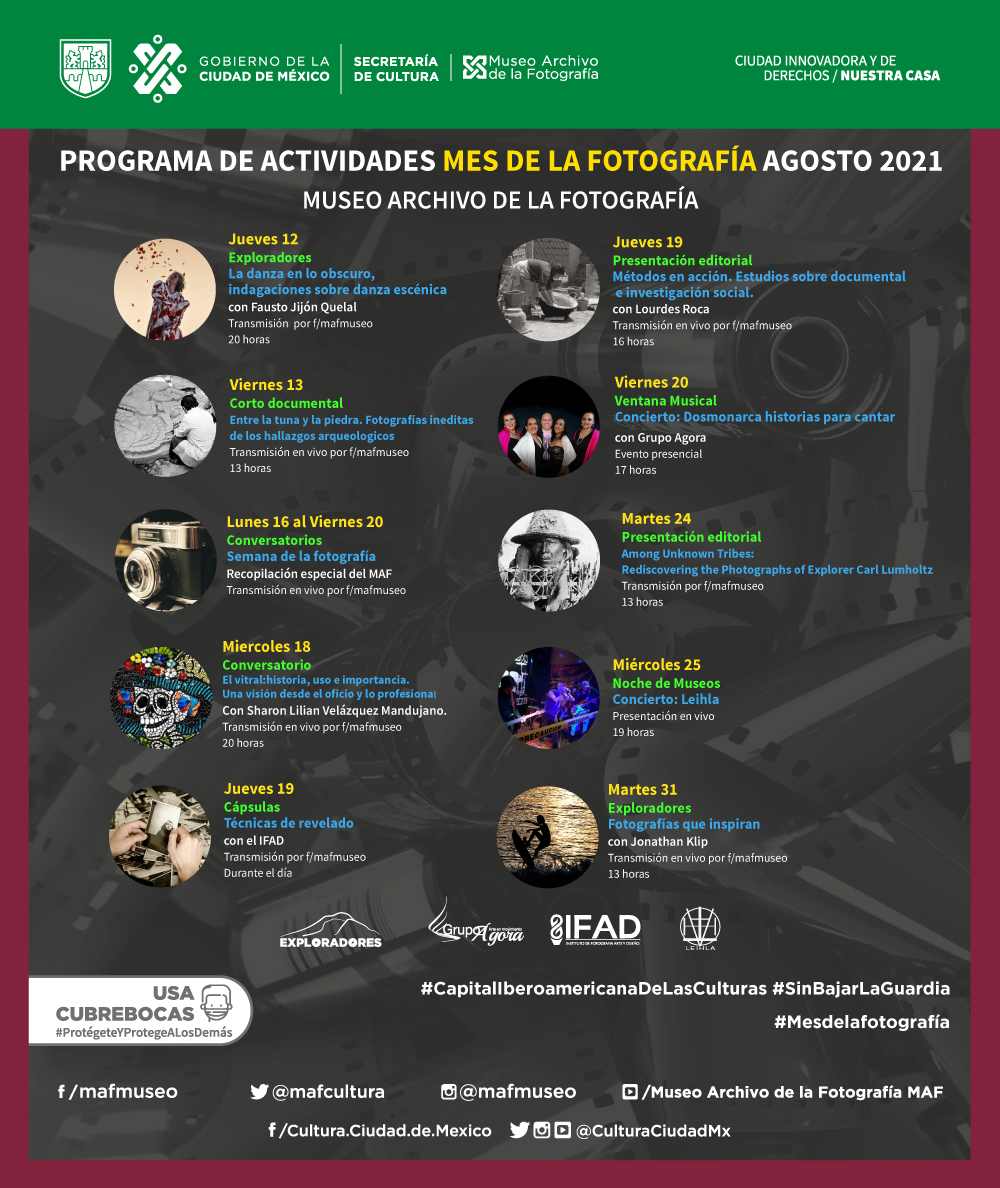 @mafcultura conmemora el#MesDeLaFotografía con actividades presenciales y virtuales. Checa la programación y recuerda,#DisfrutaSinBajarLaGuardia. Sigue las transmisiones a través de su streaming de Facebook: https://bit.ly/3sofksX#CapitalIberoamericanaDeLasCulturas#CDMXpic.twitter.com/6tYgZnTXmm