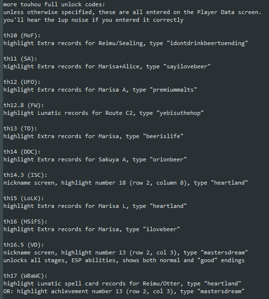 update 2: i've found 11 more Touhou unlock codes, this time in all of ZUN's games from TH10 through TH17 (except for Double Spoiler). can you guess the theme? also added to the appropriate TCRF articles here: https://tcrf.net/Category:Touhou_Project_series … (and now to wait for TH18)pic.twitter.com/uTFgxwvr2p