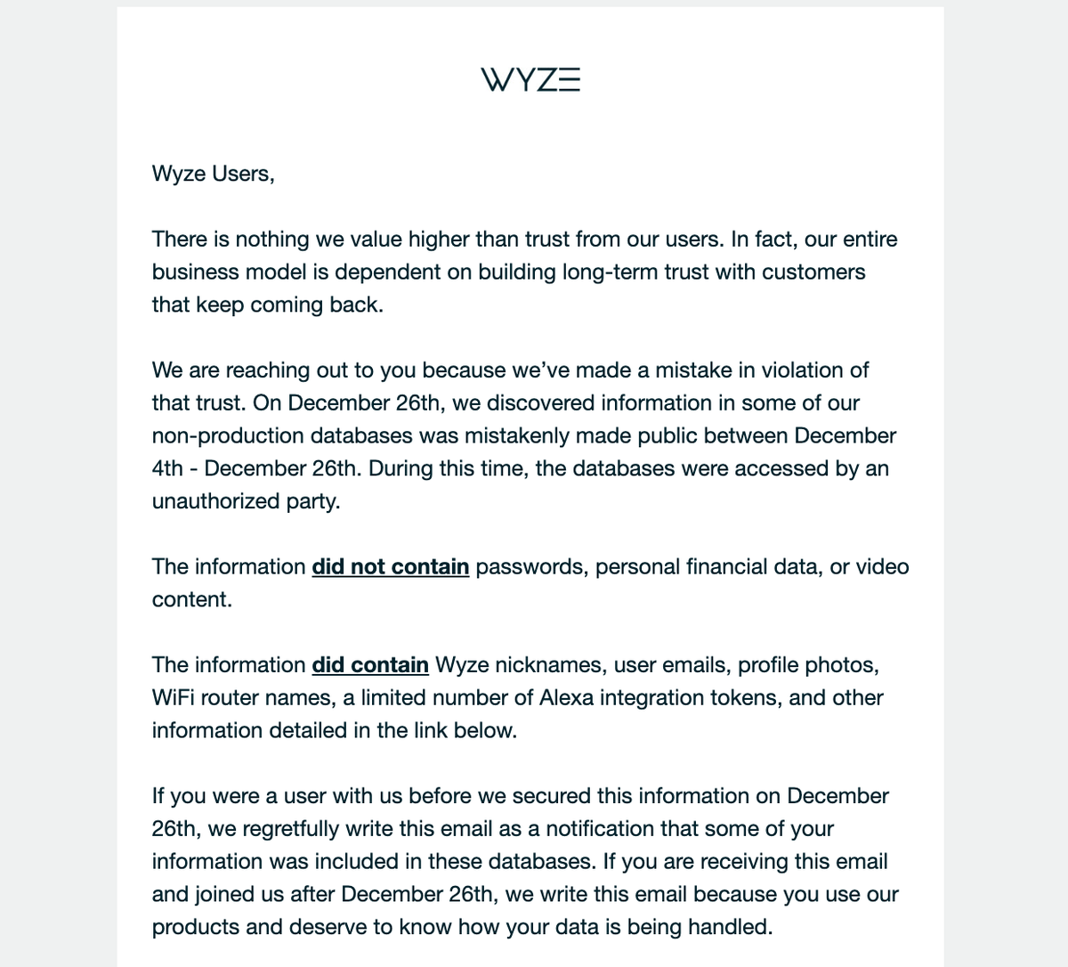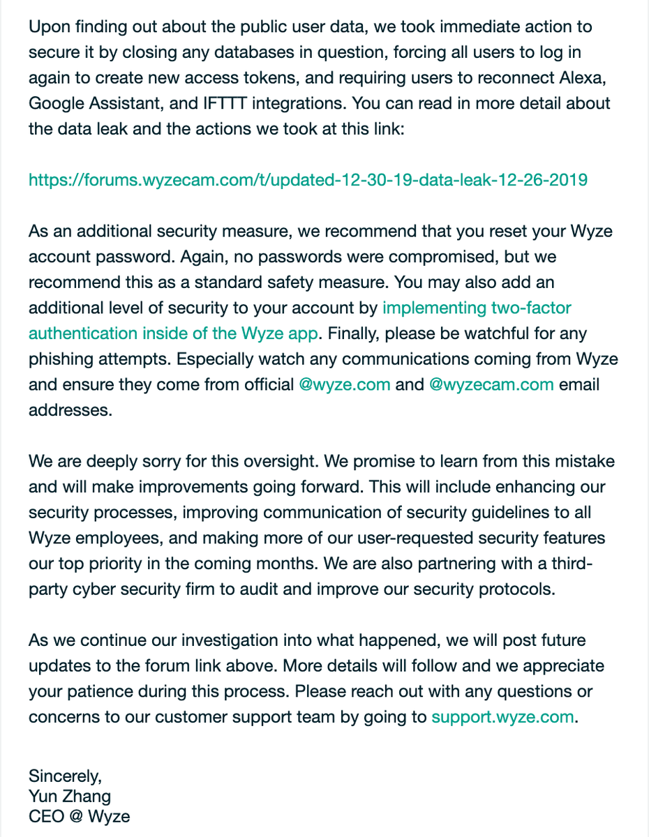 We sent an email to all Wyze users this morning regarding a data leak that occurred. You can read in more detail about it and the actions we took here: https://forums.wyzecam.com/t/updated-12-30-19-data-leak-12-26-2019 …. Please reach out with any questions or concerns to http://support.wyze.com .pic.twitter.com/ZEyaBdoaxt