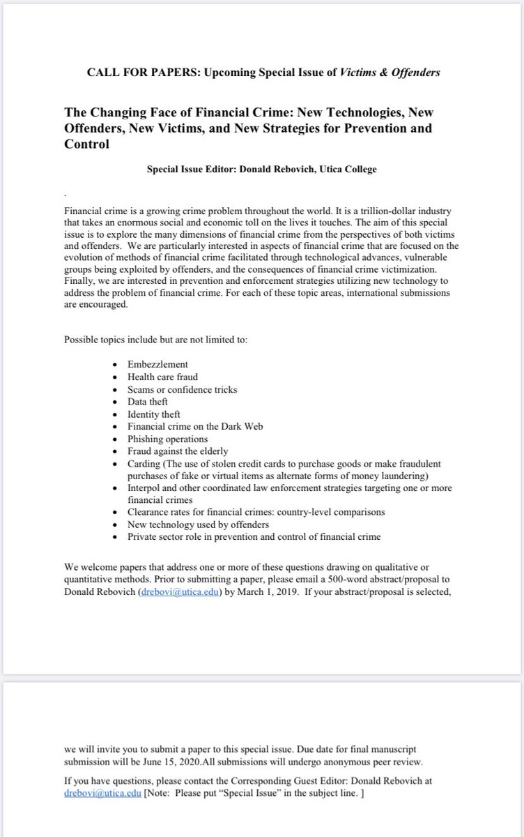 #cybercrime scholars here’s a great opportunity if you study#fraud#theft#interpersonal cybercrimes from different perspectives. It’s a great opportunity for#criminaljustice#criminology#sociology and#victimology research.https://twitter.com/profbyrne/status/1220484230049746945 …