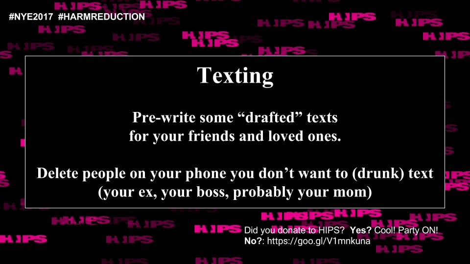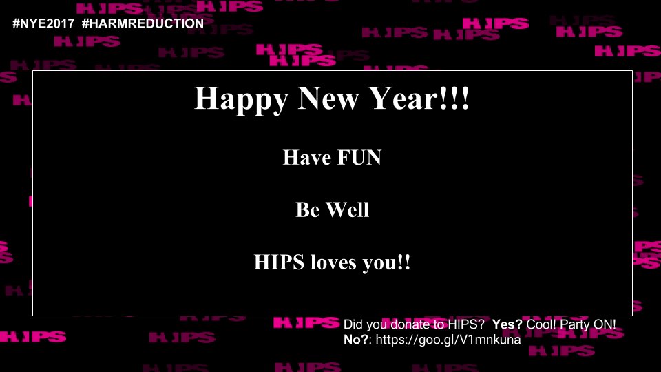 Time for HIPS NYE Harm Reduction Tips! Have a great night and party Safe(r)! Will you help us spread the word? Don't forget to say BYE 2017 with a donation to HIPS! http://ow.ly/Omv430hvsGz pic.twitter.com/2jY12OqZzP