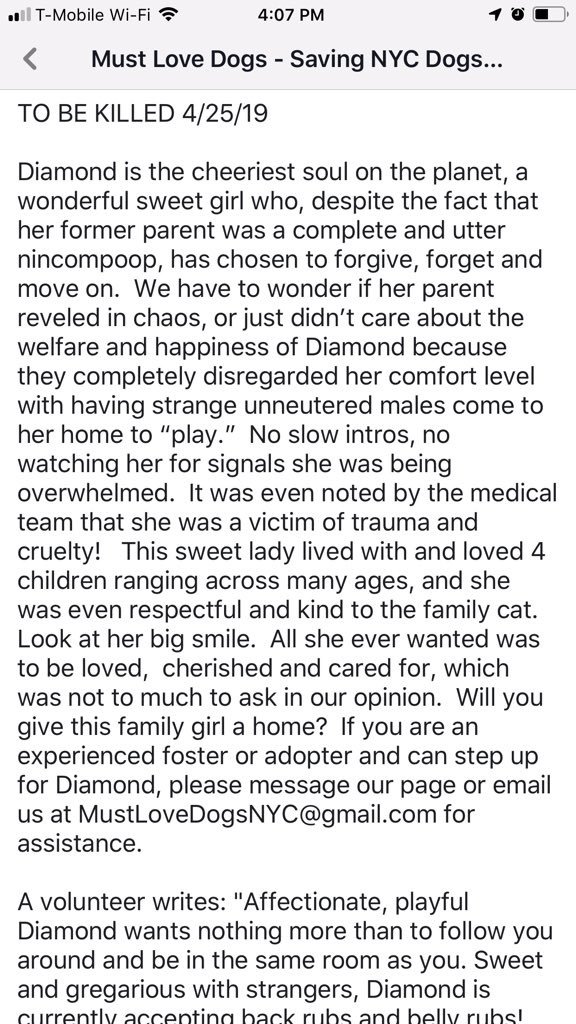@chortletown to attract a Rescue or foster/Adopter. Sharing saves: PLEASE RT DIAMOND! https://www.facebook.com/mldsavingnycdogs/photos/to-be-killed-42519diamond-is-the-cheeriest-soul-on-the-planet-a-wonderful-sweet-/962862777233326/ …pic.twitter.com/yCHmS5WRMo