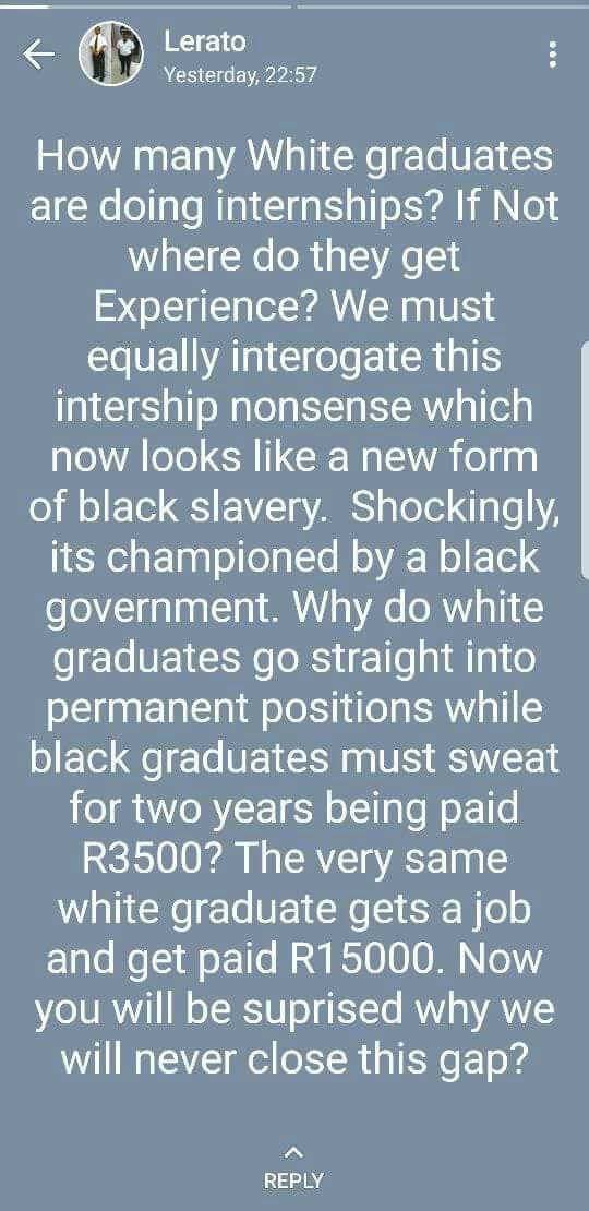 Internships should not be regarded as work opportunities but an extension of ones tertiary qualification.