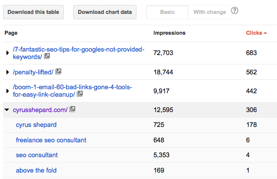 THIS HUGE! “@CyrusShepard: Wow, Webmaster Tools now showing exact keyword clicks for each URL. Ht @thogenhaven pic.twitter.com/M6Js1K00tK”