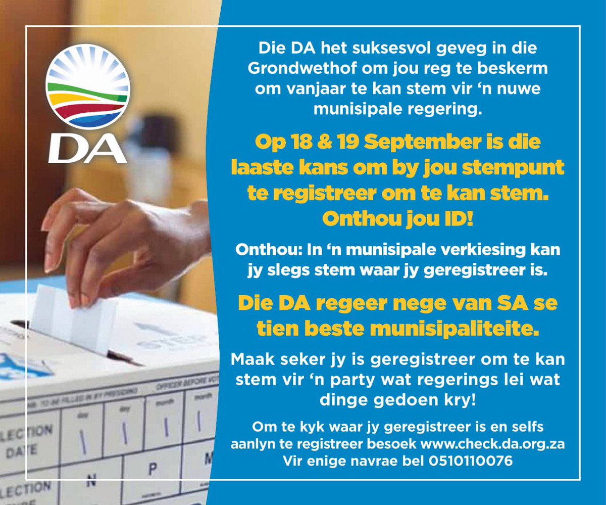 Besoek http://check.da.org.za en registreer om te stem op 18 of 19 September 2021 by jou naaste stempunt.